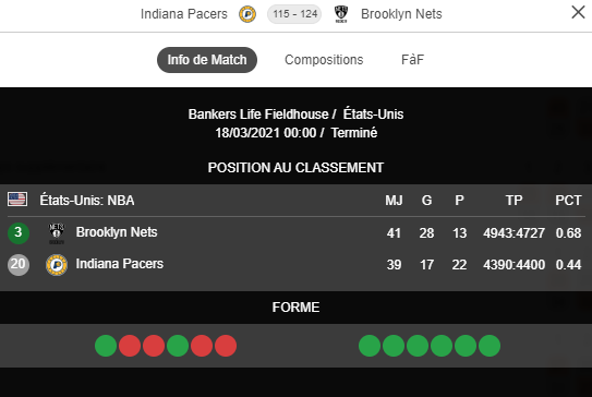 Pour être au parfum de tout ce qui se passe dans la sphère basket, notre outil flashscore basketball est une référence pour de nombreux passionnés de ce sport. Il vous fournira entre autres les scores en direct de la NBA, les résultats de chaque match, la forme de chaque formation en considérant les six dernières rencontres disputées, la composition des équipes, les probabilités de victoire et le classement de toutes les équipes selon la conférence. Rassurez-vous, il n'y en a pas que pour la NBA. Notre catalogue d'évènements et de matchs sur ce sport est très vaste.